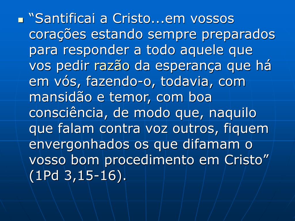 “Santificai a Cristo...em vossos corações estando sempre preparados para responder a todo aquele que vos pedir razão da esperança que há em vós, fazendo-o, todavia, com mansidão e temor, com boa consciência, de modo que, naquilo que falam contra voz outros, fiquem envergonhados os que difamam o vosso bom procedimento em Cristo” (1Pd 3,15-16).