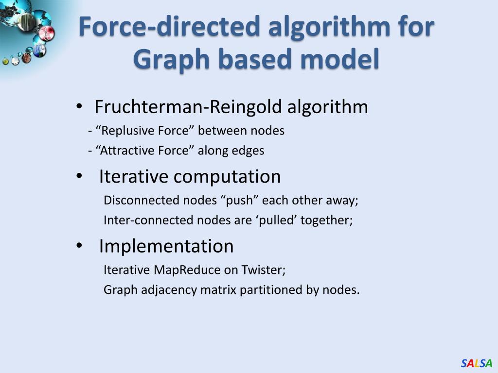 Force-directed algorithm for Graph based model Fruchterman-Reingoldalgorithm - “Replusive Force” between nodes - “Attractive Force” along edges Iterative computation Disconnected nodes “push” each other away; Inter-connected nodes are ‘pulled’ together; Implementation Iterative MapReduce on Twister; Graph adjacency matrix partitioned by nodes.