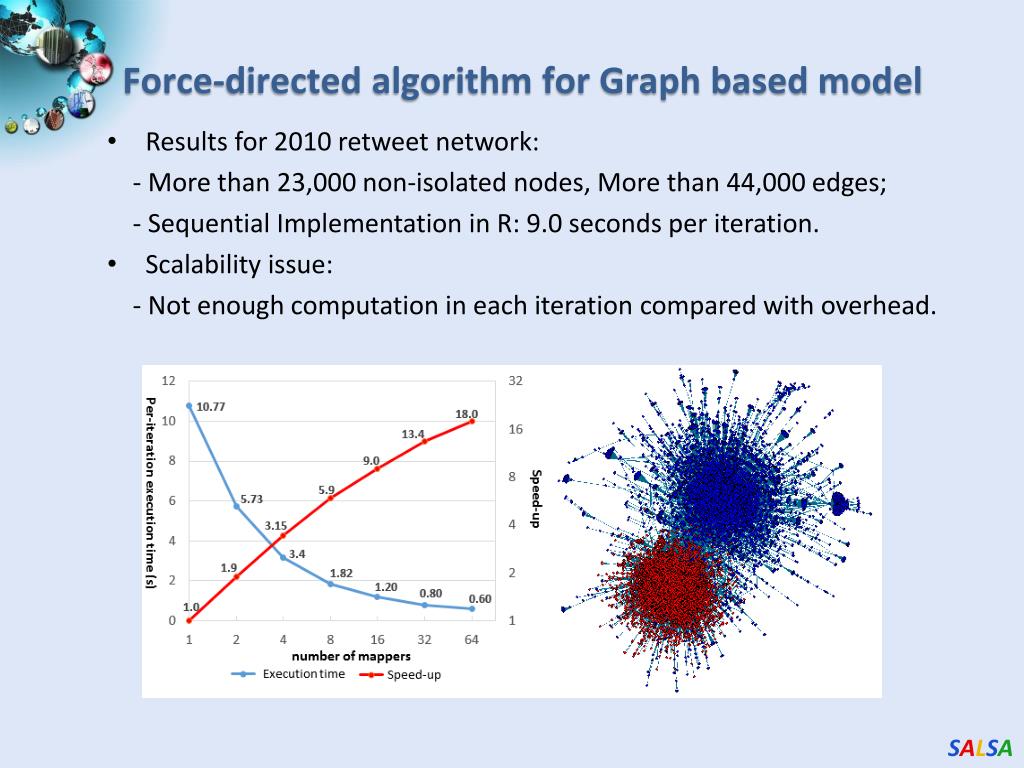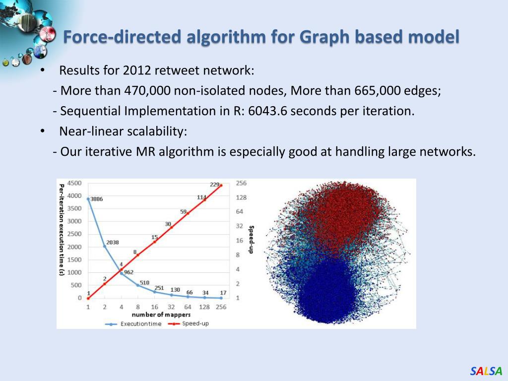 Force-directed algorithm for Graph based model Results for 2012 retweet network: - More than 470,000 non-isolated nodes, More than 665,000 edges; - Sequential Implementation in R: 6043.6 seconds per iteration. Near-linear scalability: - Our iterative MR algorithm is especially good at handling large networks.