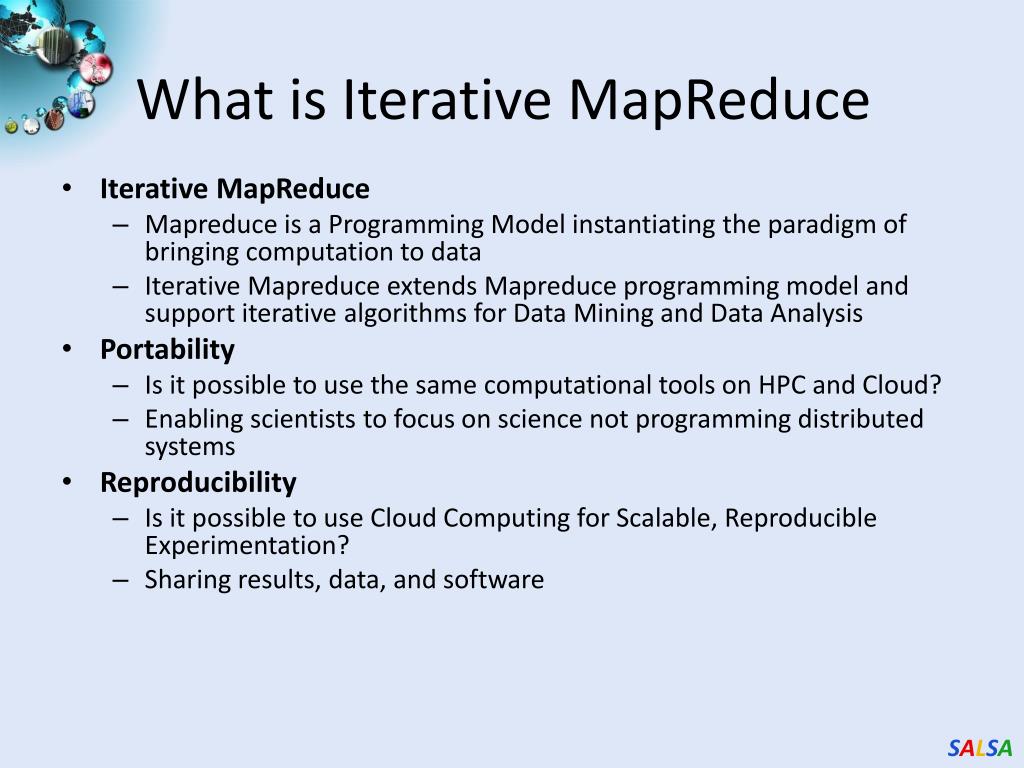 What is Iterative MapReduce • Iterative MapReduce • Mapreduce is a Programming Model instantiating the paradigm of bringing computation to data • Iterative Mapreduce extends Mapreduce programming model and support iterative algorithms for Data Mining and Data Analysis • Portability • Is it possible to use the same computational tools on HPC and Cloud? • Enabling scientists to focus on science not programming distributed systems • Reproducibility • Is it possible to use Cloud Computing for Scalable, Reproducible Experimentation? • Sharing results, data, and software
