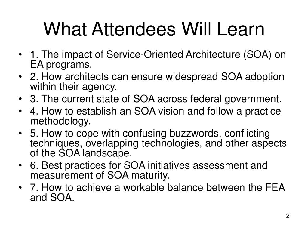 What Attendees Will Learn • 1. The impact of Service-Oriented Architecture (SOA) on EA programs. • 2. How architects can ensure widespread SOA adoption within their agency. • 3. The current state of SOA across federal government. • 4. How to establish an SOA vision and follow a practice methodology. • 5. How to cope with confusing buzzwords, conflicting techniques, overlapping technologies, and other aspects of the SOA landscape. • 6. Best practices for SOA initiatives assessment and measurement of SOA maturity. • 7. How to achieve a workable balance between the FEA and SOA.