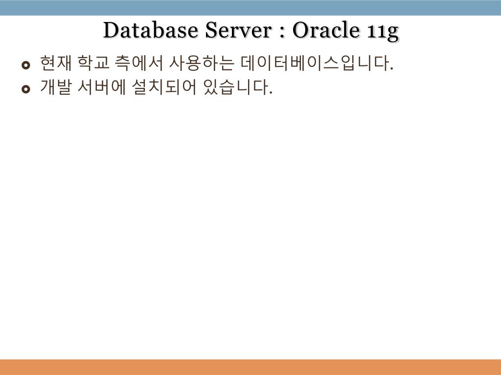 Database Server : Oracle 11g • 현재 학교 측에서 사용하는 데이터베이스입니다. • 개발 서버에 설치되어 있습니다.