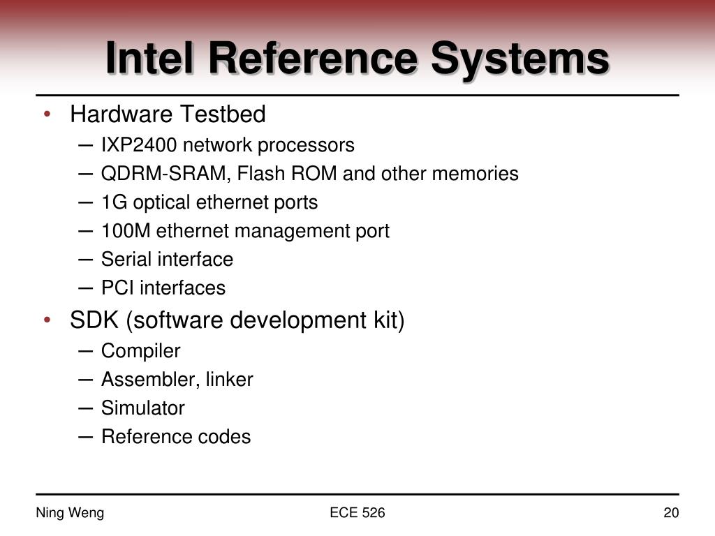 Intel Reference Systems • Hardware Testbed • IXP2400 network processors • QDRM-SRAM, Flash ROM and other memories • 1G optical ethernet ports • 100M ethernet management port • Serial interface • PCI interfaces • SDK (software development kit) • Compiler • Assembler, linker • Simulator • Reference codes ECE 526