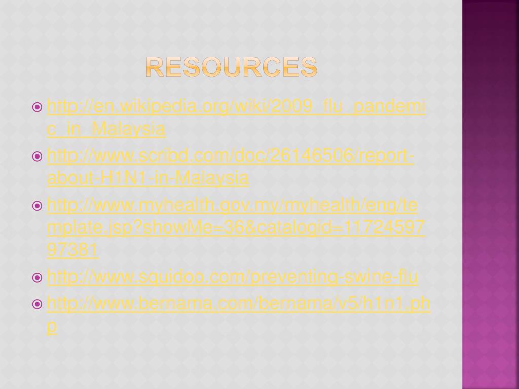 RESOURCES • http://en.wikipedia.org/wiki/2009_flu_pandemic_in_Malaysia • http://www.scribd.com/doc/26146506/report-about-H1N1-in-Malaysia • http://www.myhealth.gov.my/myhealth/eng/template.jsp?showMe=36&catalogid=1172459797381 • http://www.squidoo.com/preventing-swine-flu • http://www.bernama.com/bernama/v5/h1n1.php