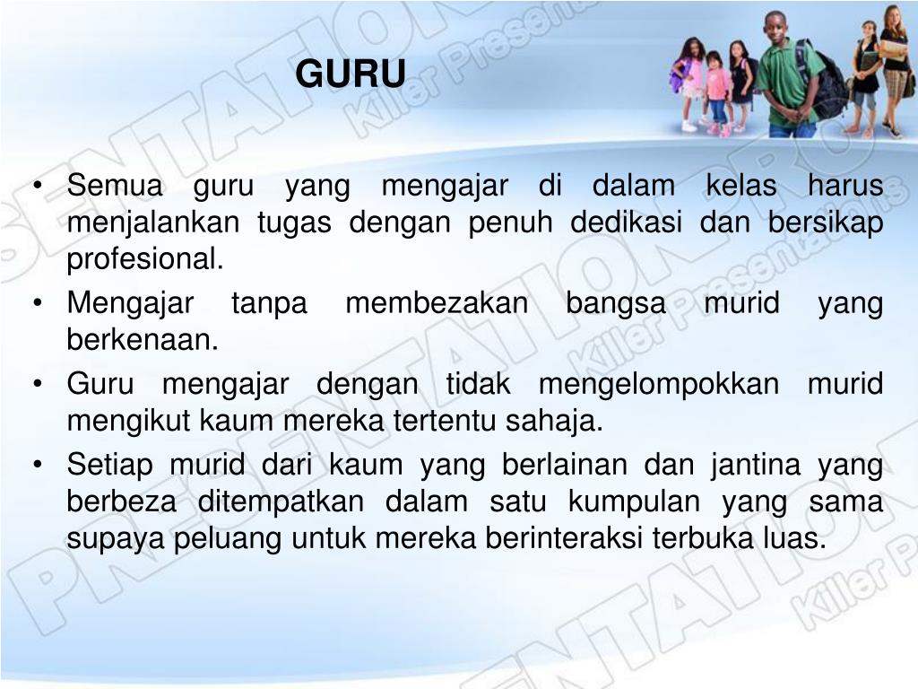 GURU • Semua guru yang mengajardidalamkelasharusmenjalankantugasdenganpenuhdedikasidanbersikapprofesional. • Mengajartanpamembezakanbangsamurid yang berkenaan. • Guru mengajardengantidakmengelompokkanmuridmengikutkaummerekatertentusahaja. • Setiapmuriddarikaum yang berlainandanjantina yang berbezaditempatkandalamsatukumpulan yang samasupayapeluanguntukmerekaberinteraksiterbukaluas.