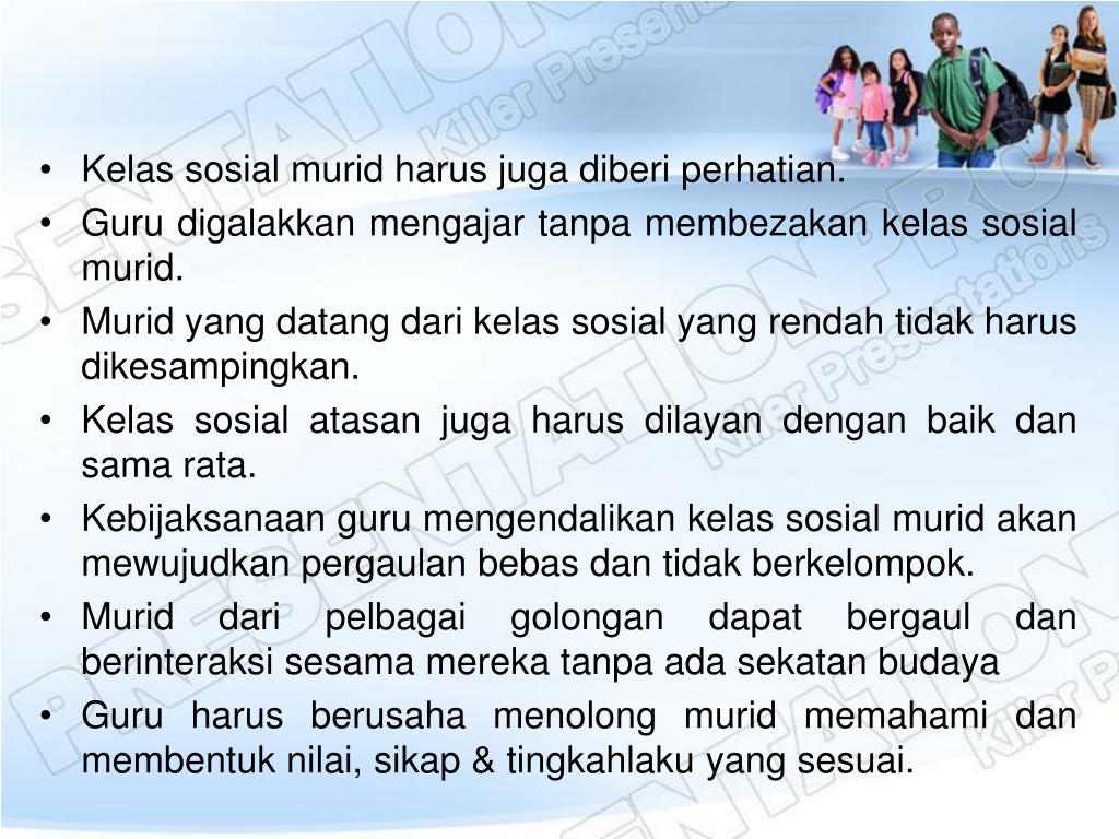Kelassosialmuridharusjugadiberiperhatian. • Guru digalakkanmengajartanpamembezakankelassosialmurid. • Murid yang datangdarikelassosial yang rendahtidakharusdikesampingkan. • Kelassosialatasanjugaharusdilayandenganbaikdansama rata. • Kebijaksanaan guru mengendalikankelassosialmuridakanmewujudkanpergaulanbebasdantidakberkelompok. • Muriddaripelbagaigolongandapatbergauldanberinteraksisesamamerekatanpaadasekatanbudaya • Guru harusberusahamenolongmuridmemahamidanmembentuknilai, sikap & tingkahlakuyang sesuai.