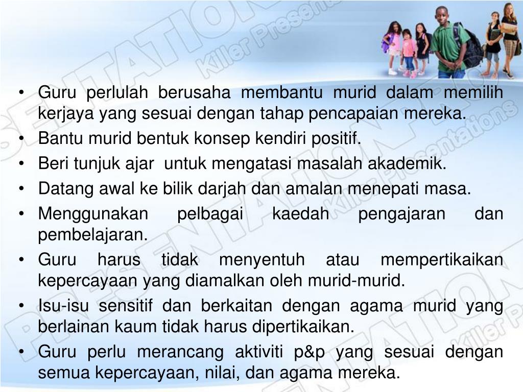 Guru perlulahberusahamembantumuriddalammemilihkerjaya yang sesuaidengantahappencapaianmereka. • Bantu muridbentukkonsepkendiripositif. • Beritunjuk ajar untukmengatasimasalahakademik. • Datangawalkebilikdarjahdanamalanmenepatimasa. • Menggunakanpelbagaikaedahpengajarandanpembelajaran. • Guru harustidakmenyentuhataumempertikaikankepercayaan yang diamalkanolehmurid-murid. • Isu-isusensitifdanberkaitandengan agama murid yang berlainankaumtidakharusdipertikaikan. • Guru perlumerancangaktivitip&p yang sesuaidengansemuakepercayaan, nilai, dan agama mereka.