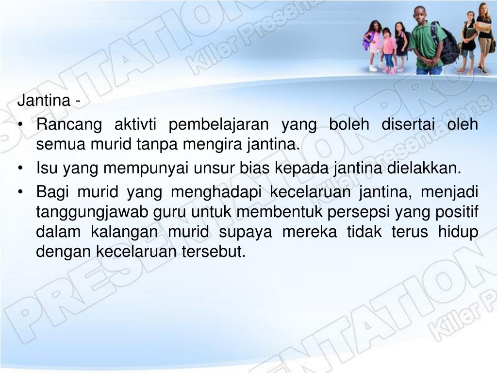 Jantina - • Rancangaktivtipembelajaran yang bolehdisertaiolehsemuamuridtanpamengirajantina. • Isu yang mempunyaiunsur bias kepadajantinadielakkan. • Bagimurid yang menghadapikecelaruanjantina, menjaditanggungjawab guru untukmembentukpersepsi yang positifdalamkalanganmuridsupayamerekatidakterushidupdengankecelaruantersebut.