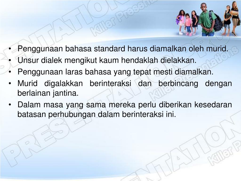 Penggunaanbahasa standard harusdiamalkanolehmurid. • Unsurdialekmengikutkaumhendaklahdielakkan. • Penggunaanlarasbahasa yang tepatmestidiamalkan. • Muriddigalakkanberinteraksidanberbincangdenganberlainanjantina. • Dalammasa yang samamerekaperludiberikankesedaranbatasanperhubungandalamberinteraksiini.