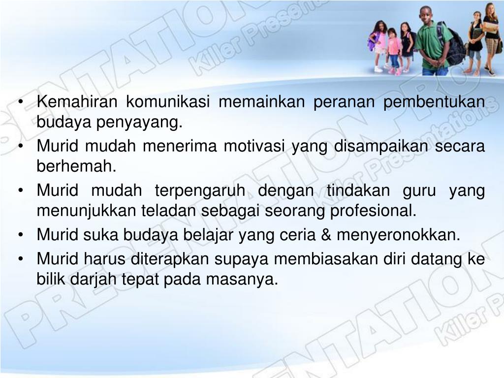 Kemahirankomunikasimemainkanperananpembentukanbudayapenyayang.Kemahirankomunikasimemainkanperananpembentukanbudayapenyayang. • Muridmudahmenerimamotivasi yang disampaikansecaraberhemah. • Muridmudahterpengaruhdengantindakan guru yang menunjukkanteladansebagaiseorangprofesional. • Muridsukabudayabelajar yang ceria & menyeronokkan. • Muridharusditerapkansupayamembiasakandiridatangkebilikdarjahtepatpadamasanya.