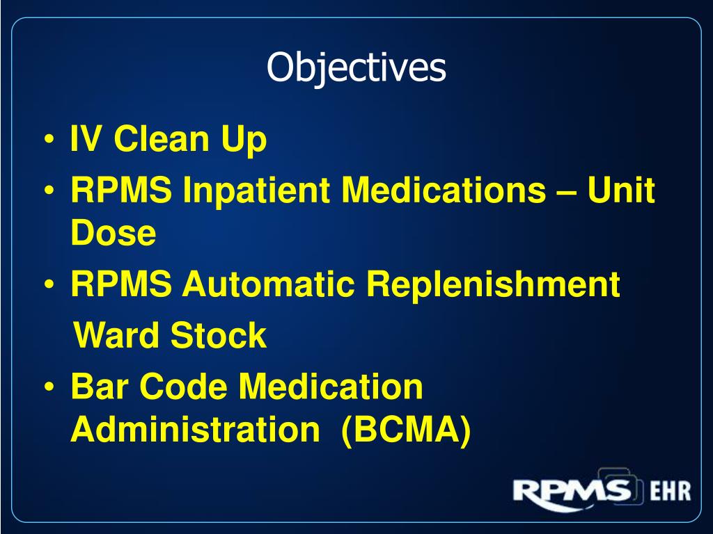Inpatient Pharmacy. October 2008. Objectives. IV Clean Up RPMS Inpatient Medications – Unit Dose RPMS Automatic Replenishment Ward Stock Bar Code Medication Administration (BCMA). IV Clean Up. Why clean up the IV package?.