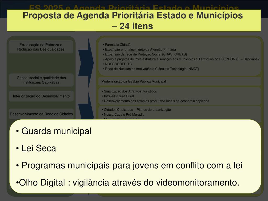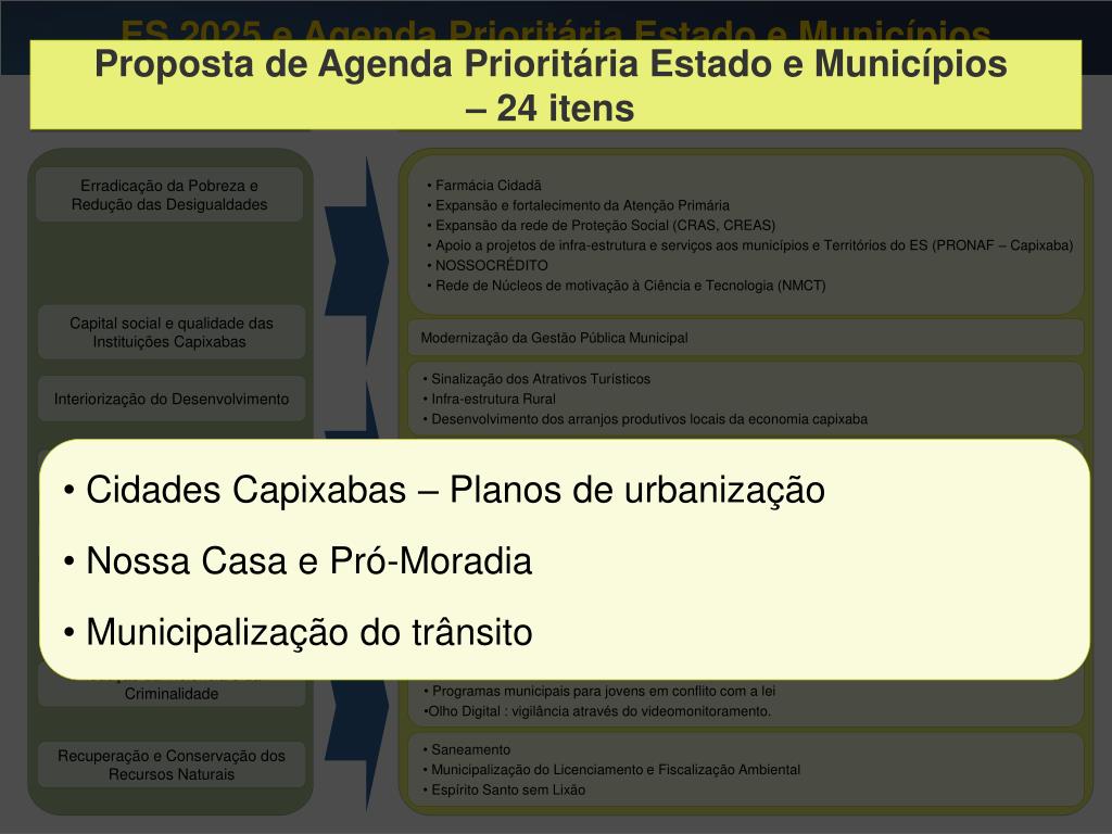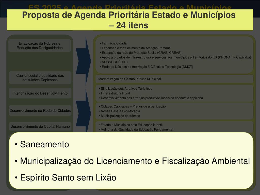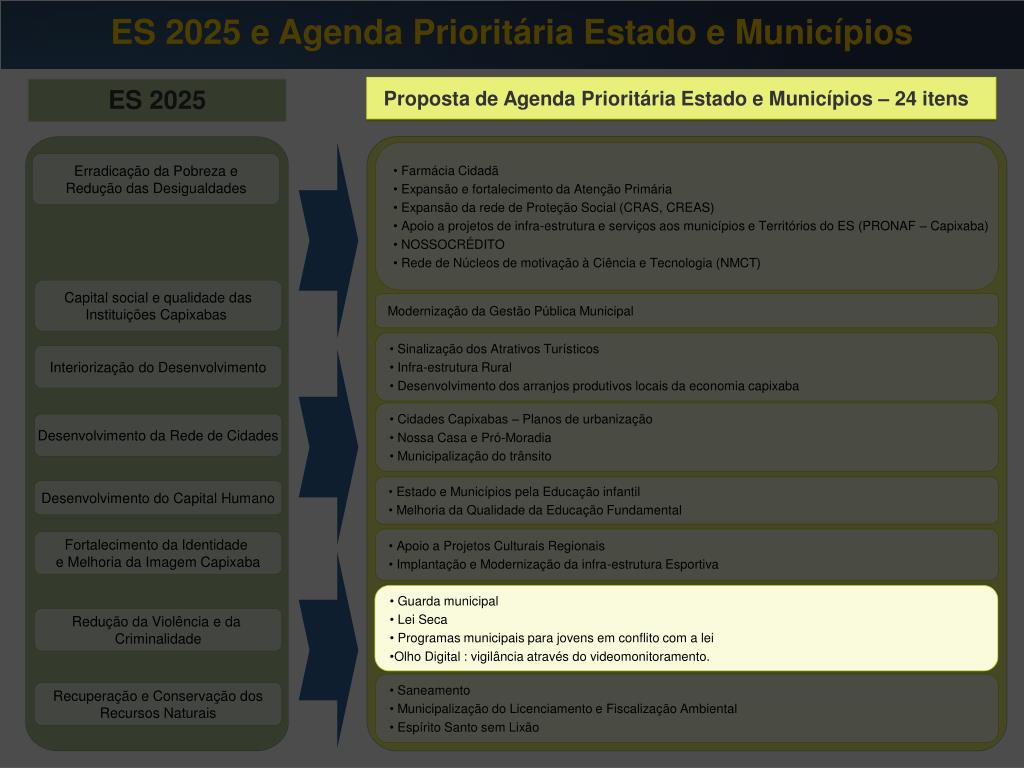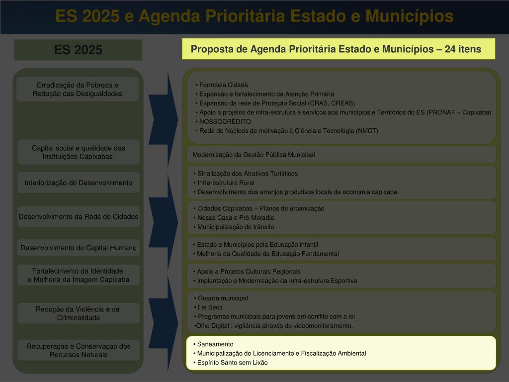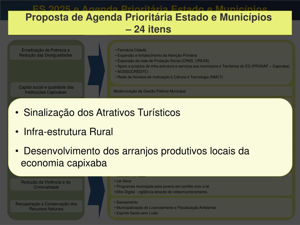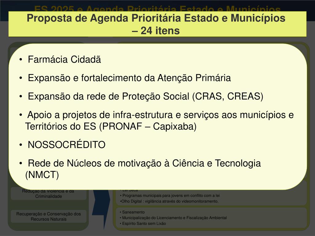 ES 2025 e Agenda Prioritária Estado e Municípios Proposta de Agenda Prioritária Estado e Municípios – 24 itens ES 2025 Proposta de Agenda Prioritária Estado e Municípios – 24 itens • Farmácia Cidadã • Expansão e fortalecimento da Atenção Primária • Expansão da rede de Proteção Social (CRAS, CREAS) • Apoio a projetos de infra-estrutura e serviços aos municípios e Territórios do ES (PRONAF – Capixaba) • NOSSOCRÉDITO • Rede de Núcleos de motivação à Ciência e Tecnologia (NMCT) Erradicação da Pobreza e Redução das Desigualdades Capital social e qualidade das Instituições Capixabas Modernização da Gestão Pública Municipal • Sinalização dos Atrativos Turísticos • Infra-estrutura Rural • Desenvolvimento dos arranjos produtivos locais da economia capixaba • Sinalização dos Atrativos Turísticos • Infra-estrutura Rural • Desenvolvimento dos arranjos produtivos locais da economia capixaba Interiorização do Desenvolvimento • Cidades Capixabas – Planos de urbanização • Nossa Casa e Pró-Moradia • Municipalização do trânsito Desenvolvimento da Rede de Cidades • Estado e Municípios pela Educação infantil • Melhoria da Qualidade da Educação Fundamental Desenvolvimento do Capital Humano • Apoio a Projetos Culturais Regionais • Implantação e Modernização da infra-estrutura Esportiva Fortalecimento da Identidade e Melhoria da Imagem Capixaba • Guarda municipal • Lei Seca • Programas municipais para jovens em conflito com a lei • Olho Digital : vigilância através do videomonitoramento. Redução da Violência e da Criminalidade • Saneamento • Municipalização do Licenciamento e Fiscalização Ambiental • Espírito Santo sem Lixão Recuperação e Conservação dos Recursos Naturais