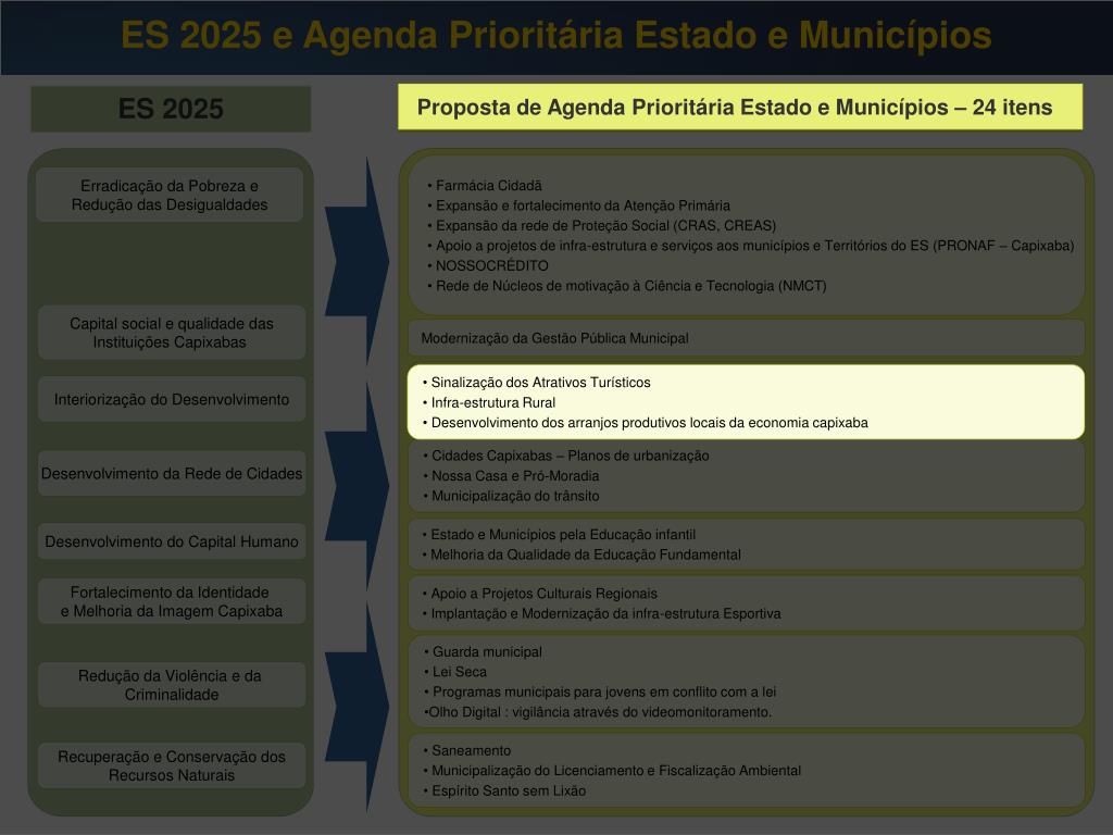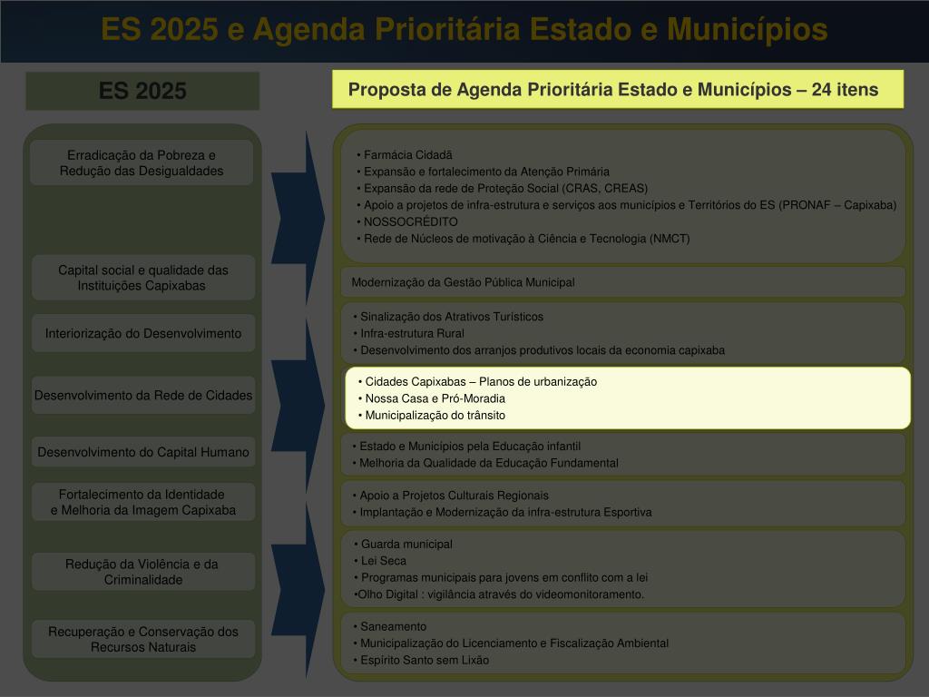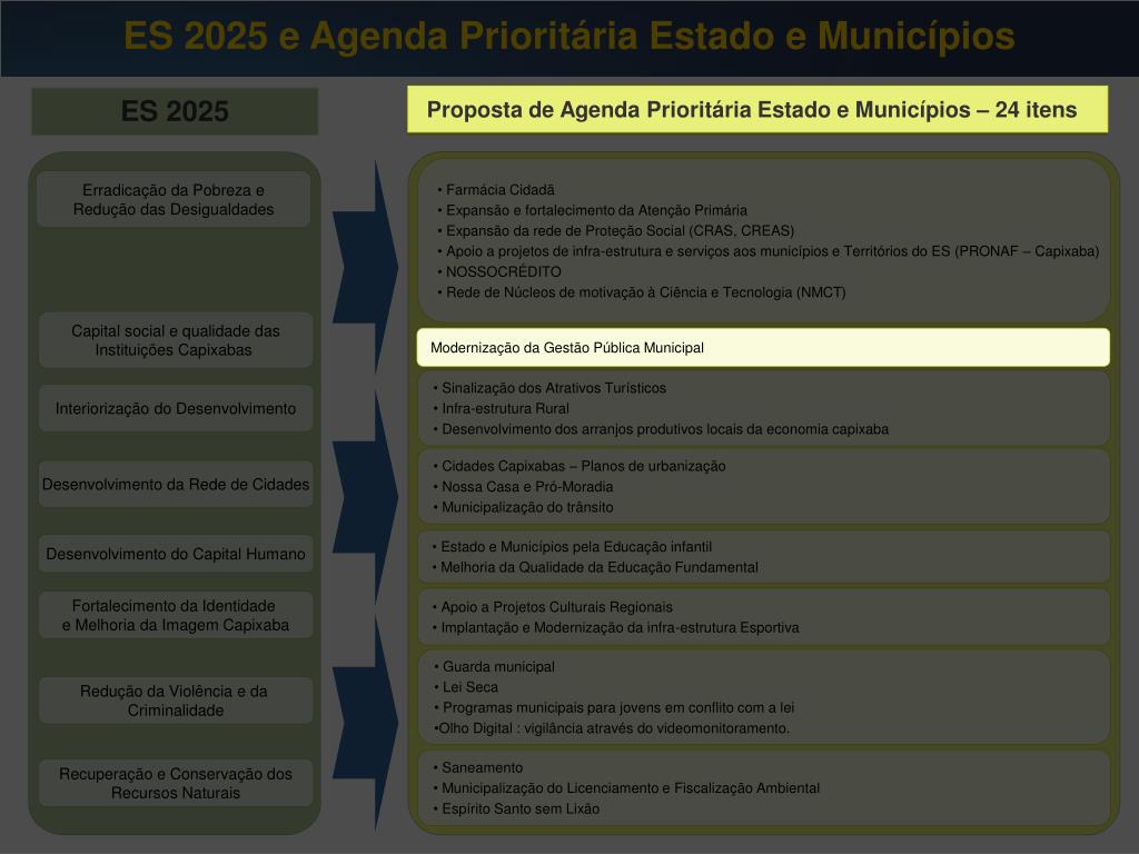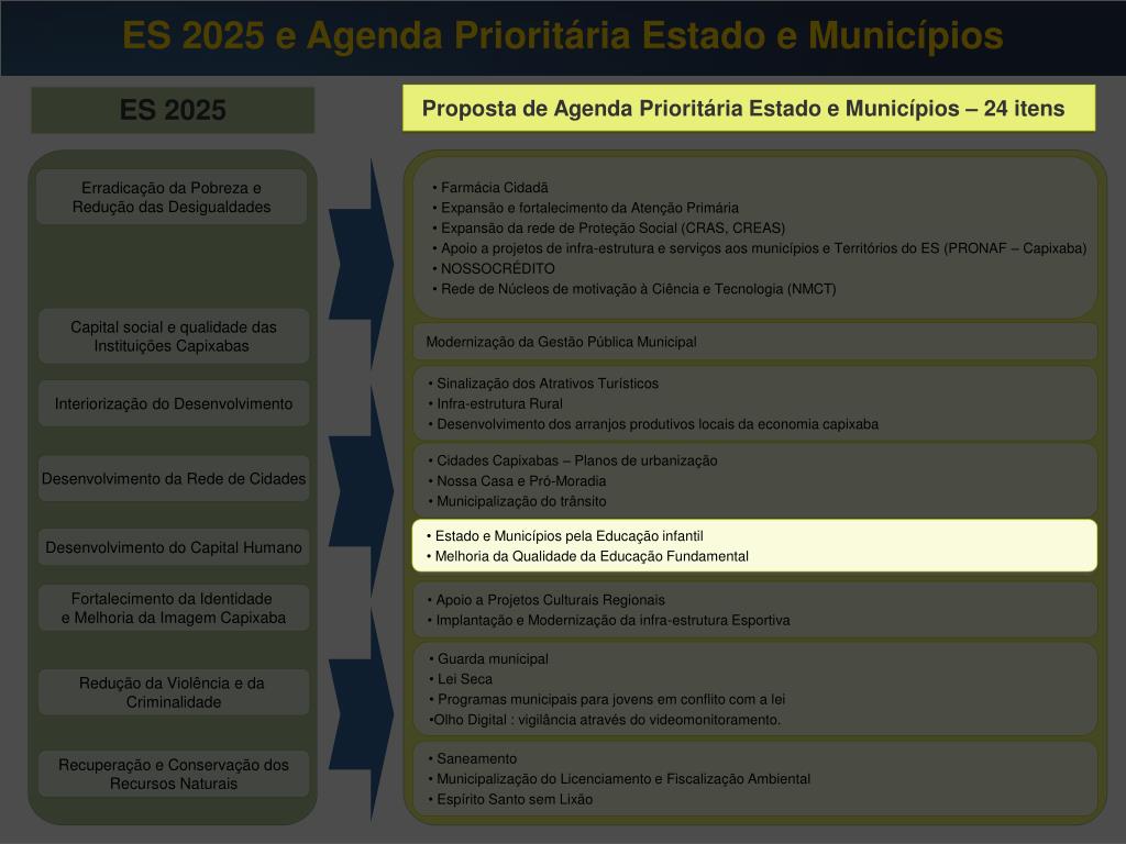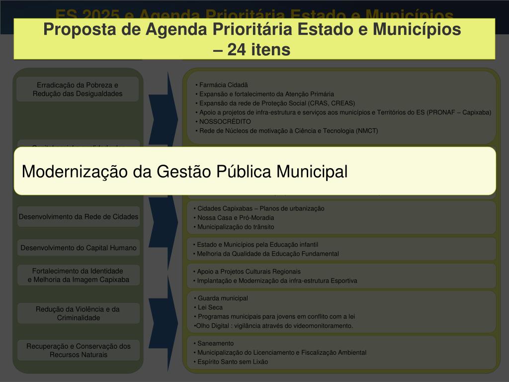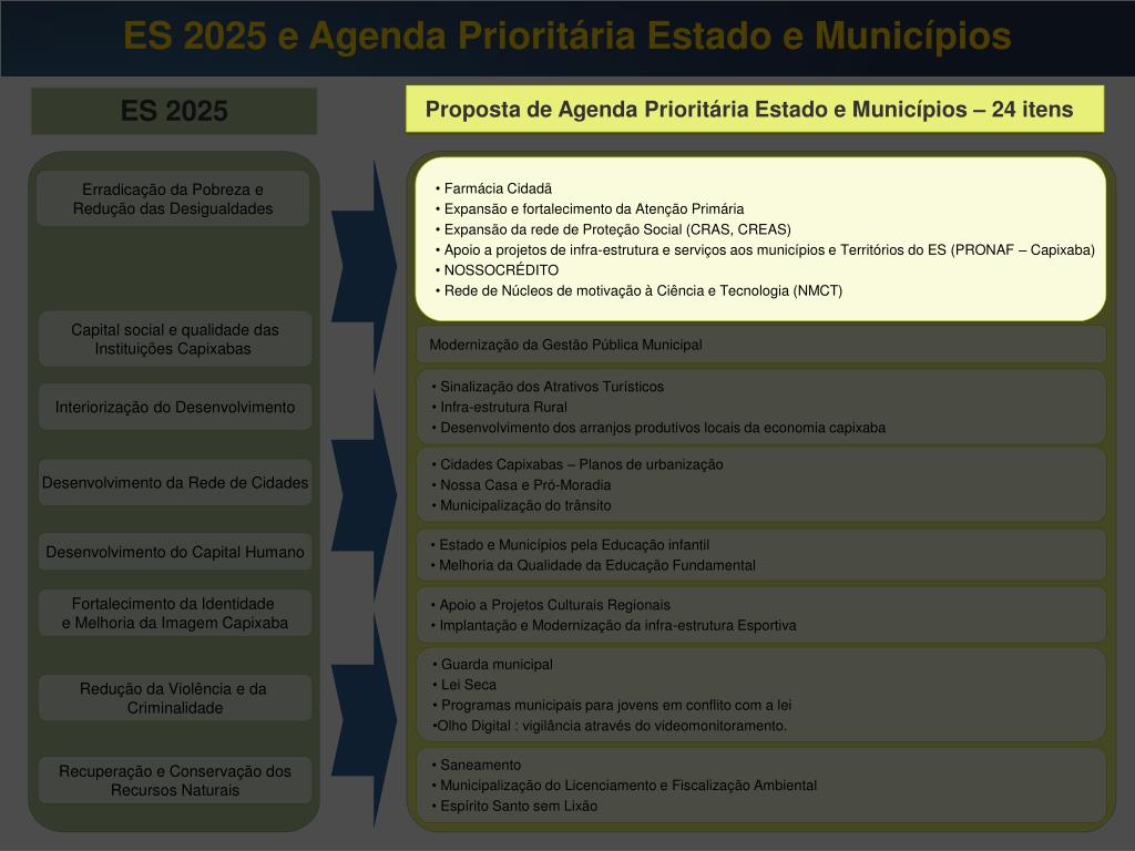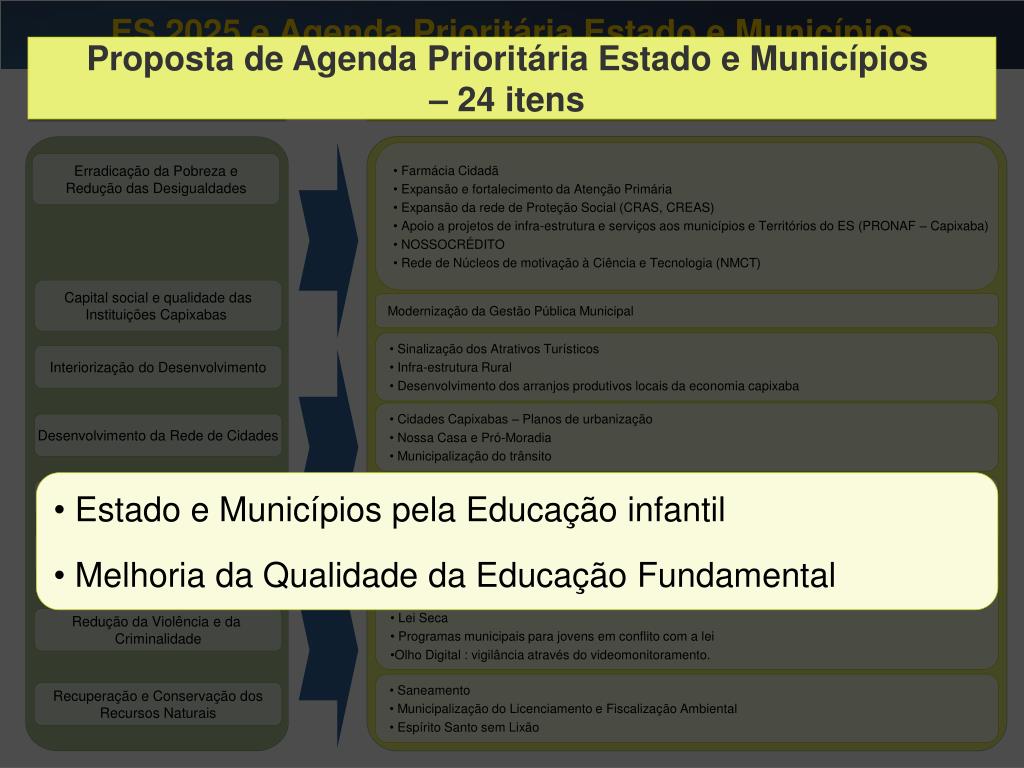 ES 2025 e Agenda Prioritária Estado e Municípios Proposta de Agenda Prioritária Estado e Municípios – 24 itens ES 2025 Proposta de Agenda Prioritária Estado e Municípios – 24 itens • Farmácia Cidadã • Expansão e fortalecimento da Atenção Primária • Expansão da rede de Proteção Social (CRAS, CREAS) • Apoio a projetos de infra-estrutura e serviços aos municípios e Territórios do ES (PRONAF – Capixaba) • NOSSOCRÉDITO • Rede de Núcleos de motivação à Ciência e Tecnologia (NMCT) Erradicação da Pobreza e Redução das Desigualdades Capital social e qualidade das Instituições Capixabas Modernização da Gestão Pública Municipal • Sinalização dos Atrativos Turísticos • Infra-estrutura Rural • Desenvolvimento dos arranjos produtivos locais da economia capixaba • Sinalização dos Atrativos Turísticos • Infra-estrutura Rural • Desenvolvimento dos arranjos produtivos locais da economia capixaba Interiorização do Desenvolvimento • Cidades Capixabas – Planos de urbanização • Nossa Casa e Pró-Moradia • Municipalização do trânsito Desenvolvimento da Rede de Cidades • Estado e Municípios pela Educação infantil • Melhoria da Qualidade da Educação Fundamental Desenvolvimento do Capital Humano • Apoio a Projetos Culturais Regionais • Implantação e Modernização da infra-estrutura Esportiva Fortalecimento da Identidade e Melhoria da Imagem Capixaba • Guarda municipal • Lei Seca • Programas municipais para jovens em conflito com a lei • Olho Digital : vigilância através do videomonitoramento. Redução da Violência e da Criminalidade • Saneamento • Municipalização do Licenciamento e Fiscalização Ambiental • Espírito Santo sem Lixão Recuperação e Conservação dos Recursos Naturais
