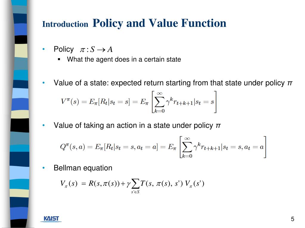 Introduction Policy and Value Function • Policy • What the agent does in a certain state • Value of a state: expected return starting from that state under policy π • Value of taking an action in a state under policy π • Bellman equation