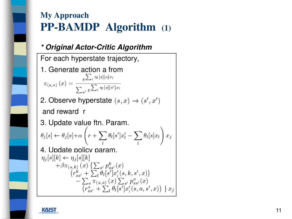 My ApproachPP-BAMDP Algorithm (1) * Original Actor-Critic Algorithm For each hyperstate trajectory, 1. Generate action a from 2. Observe hyperstate and reward r 3. Update value ftn. Param. 4. Update policy param.