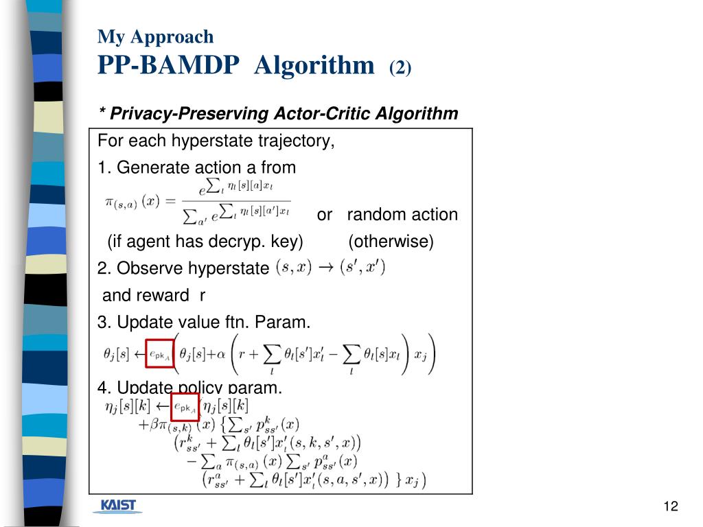 My ApproachPP-BAMDP Algorithm (2) * Privacy-Preserving Actor-Critic Algorithm For each hyperstate trajectory, 1. Generate action a from or random action (if agent has decryp. key) (otherwise) 2. Observe hyperstate and reward r 3. Update value ftn. Param. 4. Update policy param.