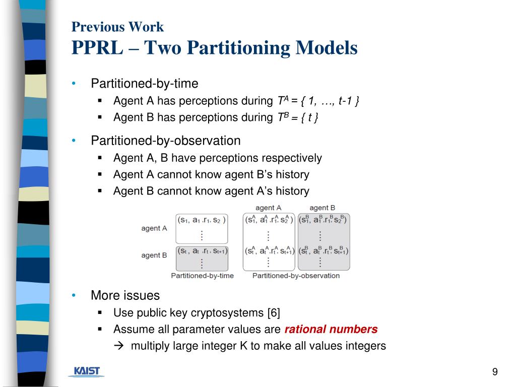 Previous WorkPPRL – Two Partitioning Models • Partitioned-by-time • Agent A has perceptions during TA = { 1, …, t-1 } • Agent B has perceptions during TB = { t } • Partitioned-by-observation • Agent A, B have perceptions respectively • Agent A cannot know agent B’s history • Agent B cannot know agent A’s history • More issues • Use public key cryptosystems [6] • Assume all parameter values are rational numbers multiply large integer K to make all values integers