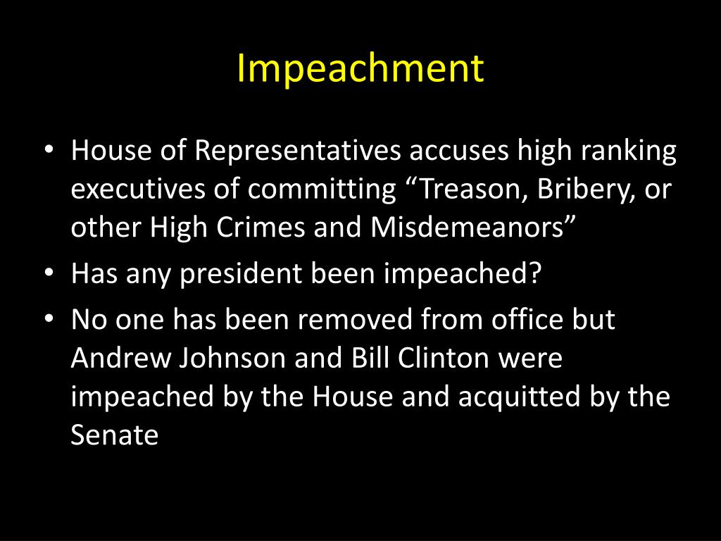 Impeachment • House of Representatives accuses high ranking executives of committing “Treason, Bribery, or other High Crimes and Misdemeanors” • Has any president been impeached? • No one has been removed from office but Andrew Johnson and Bill Clinton were impeached by the House and acquitted by the Senate