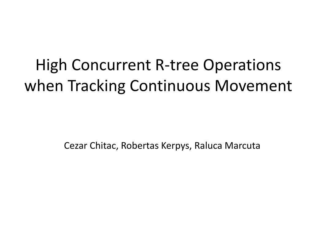 High Concurrent R-tree Operations when Tracking Continuous Movement. Cezar Chitac , Robertas Kerpys , Raluca Marcuta. Motivation. Need for tracking moving objects in real time: concurrency Organize and access positional information Queries: s earch query r ange query. Overview.