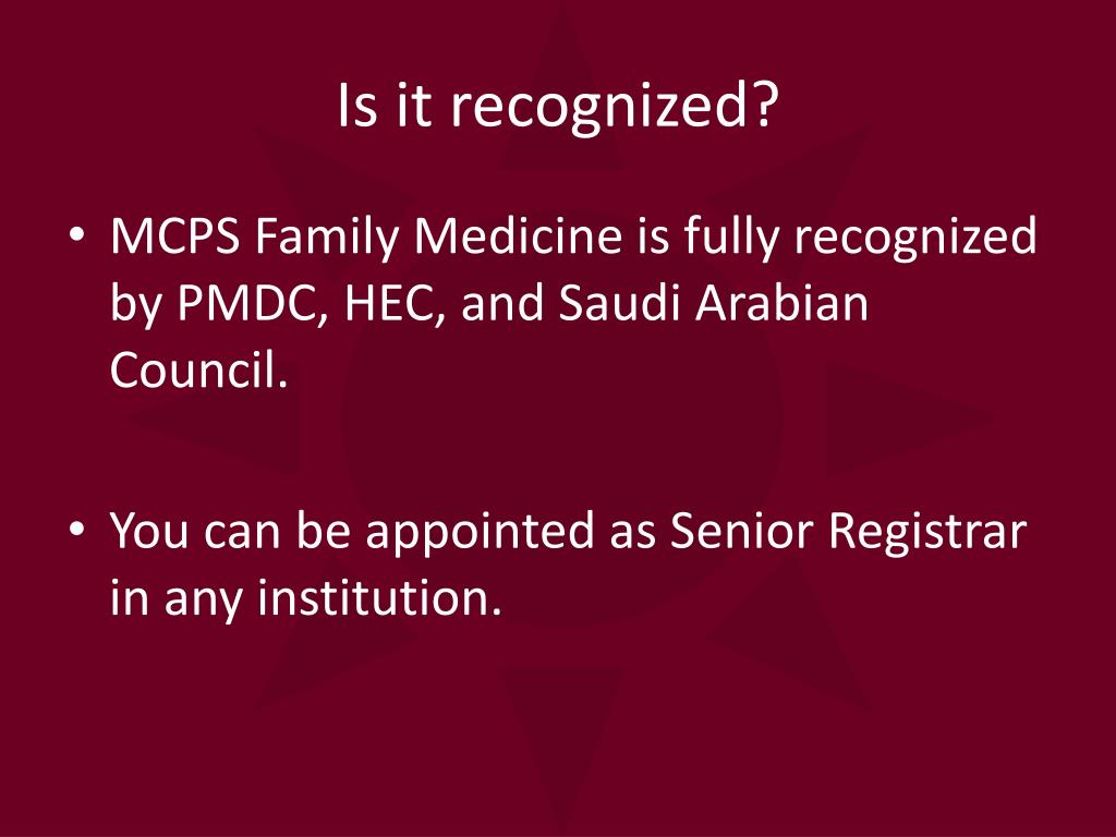 Is it recognized? • MCPS Family Medicine is fully recognized by PMDC, HEC, and Saudi Arabian Council. • You can be appointed as Senior Registrar in any institution.