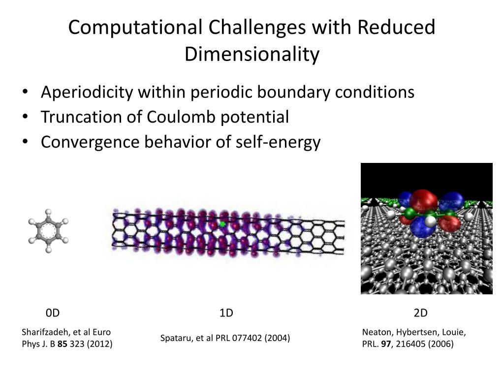 Computational Challenges with Reduced Dimensionality • Aperiodicity within periodic boundary conditions • Truncation of Coulomb potential • Convergence behavior of self-energy 0D 1D 2D Sharifzadeh, et al Euro Phys J. B 85 323 (2012) Neaton, Hybertsen, Louie, PRL. 97, 216405 (2006) Spataru, et al PRL 077402 (2004)