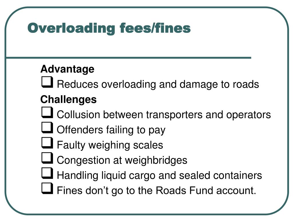 Overloading fees/fines Advantage • Reduces overloading and damage to roads Challenges • Collusion between transporters and operators • Offenders failing to pay • Faulty weighing scales • Congestion at weighbridges • Handling liquid cargo and sealed containers • Fines don’t go to the Roads Fund account.
