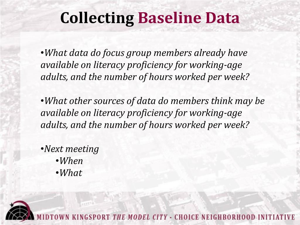 Collecting Baseline Data • What data do focus group members already have? • What other sources of data do members think may be available?