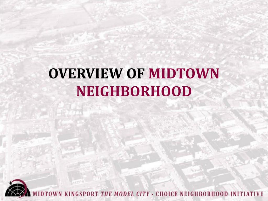 Overview of Neighborhood • Population • Kingsport City = 48,205 • Midtown Neighborhood = 4,399 • Larger African-American majority: • 4.1% in Kingsport City • 13.3% in Midtown Neighborhood • The Midtown population is slightly younger • Kingsport City – 44 yrs median age • Midtown Neighborhood – 40.5 yrs • Economic Self-Sufficiency levels, household income and household size are all lower in Model City . • Median household income in Midtown is just 39.4% of City-wide income. • Rate of home ownership • Kingsport City – 62.7% • Midtown Neighborhood – 35.1%