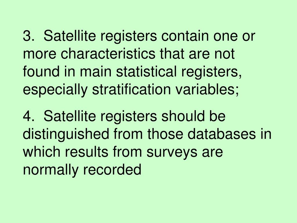 3. Satellite registers contain one or more characteristics that are not found in main statistical registers, especially stratification variables; 4. Satellite registers should be distinguished from those databases in which results from surveys are normally recorded