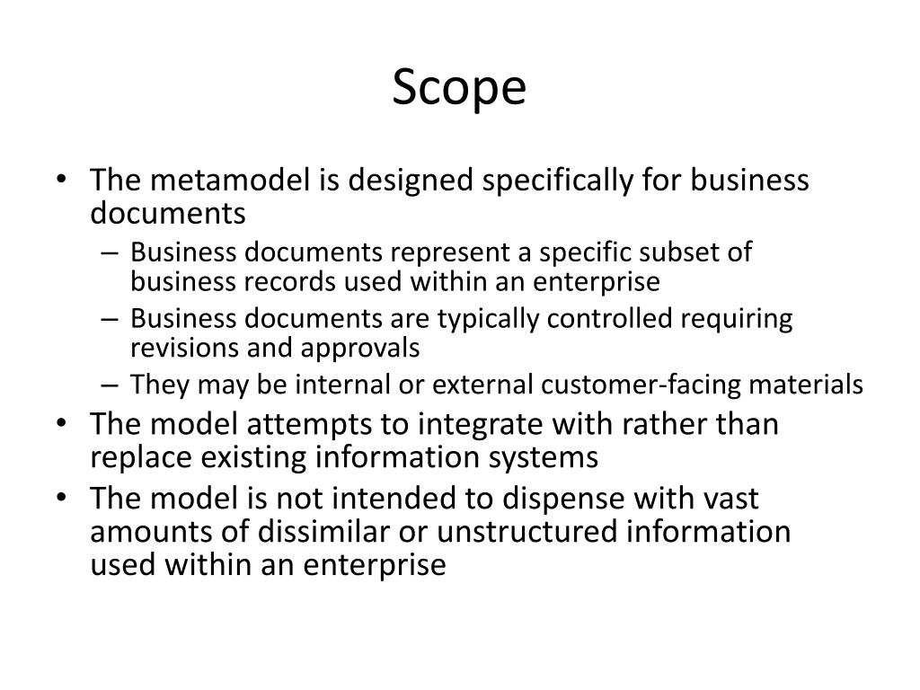 Scope • The metamodel is designed specifically for business documents • Business documents represent a specific subset of business records used within an enterprise • Business documents are typically controlled requiring revisions and approvals • They may be internal or external customer-facing materials • The model attempts to integrate with rather than replace existing information systems • The model is not intended to dispense with vast amounts of dissimilar or unstructured information used within an enterprise