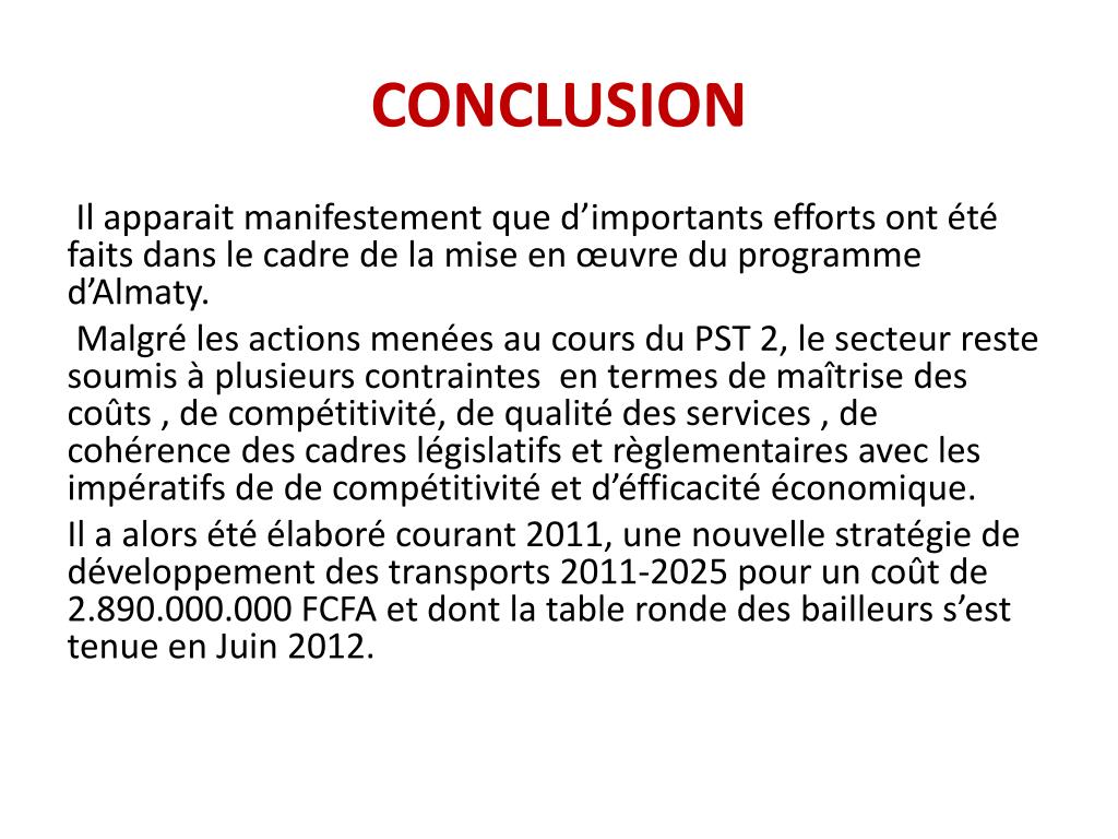 CONCLUSION Il apparait manifestement que d’importants efforts ont été faits dans le cadre de la mise en œuvre du programme d’Almaty. Malgré les actions menées au cours du PST 2, le secteur reste soumis à plusieurs contraintes en termes de maîtrise des coûts , de compétitivité, de qualité des services , de cohérence des cadres législatifs et règlementaires avec les impératifs de de compétitivité et d’éfficacité économique. Il a alors été élaboré courant 2011, une nouvelle stratégie de développement des transports 2011-2025 pour un coût de 2.890.000.000 FCFA et dont la table ronde des bailleurs s’est tenue en Juin 2012.