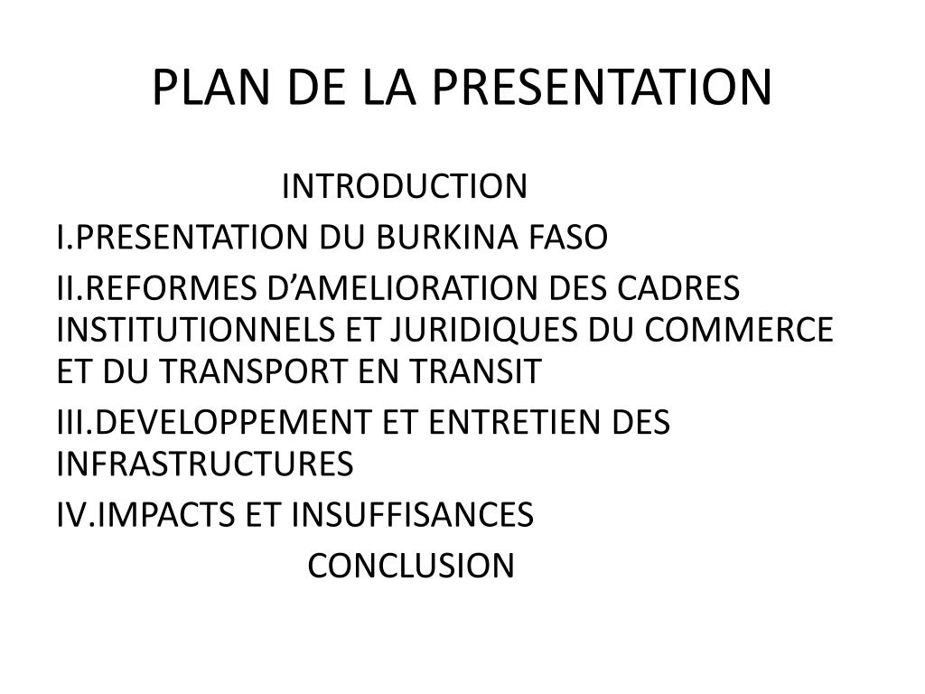 PLAN DE LA PRESENTATION INTRODUCTION • PRESENTATION DU BURKINA FASO • REFORMES D’AMELIORATION DES CADRES INSTITUTIONNELS ET JURIDIQUES DU COMMERCE ET DU TRANSPORT EN TRANSIT • DEVELOPPEMENT ET ENTRETIEN DES INFRASTRUCTURES • IMPACTS ET INSUFFISANCES CONCLUSION