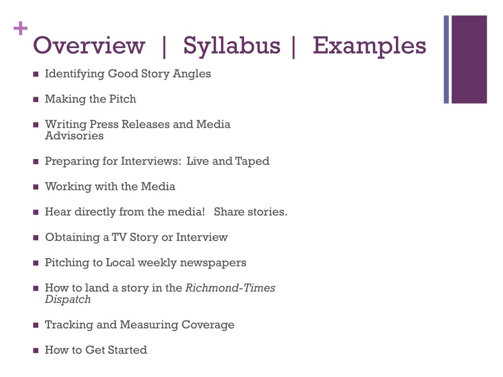 Overview | Syllabus | Examples • Identifying Good Story Angles • Making the Pitch • Writing Press Releases and Media Advisories • Preparing for Interviews: Live and Taped • Working with the Media • Hear directly from the media! Share stories. • Obtaining a TV Story or Interview • Pitching to Local weekly newspapers • How to land a story in the Richmond-Times Dispatch • Tracking and Measuring Coverage • How to Get Started