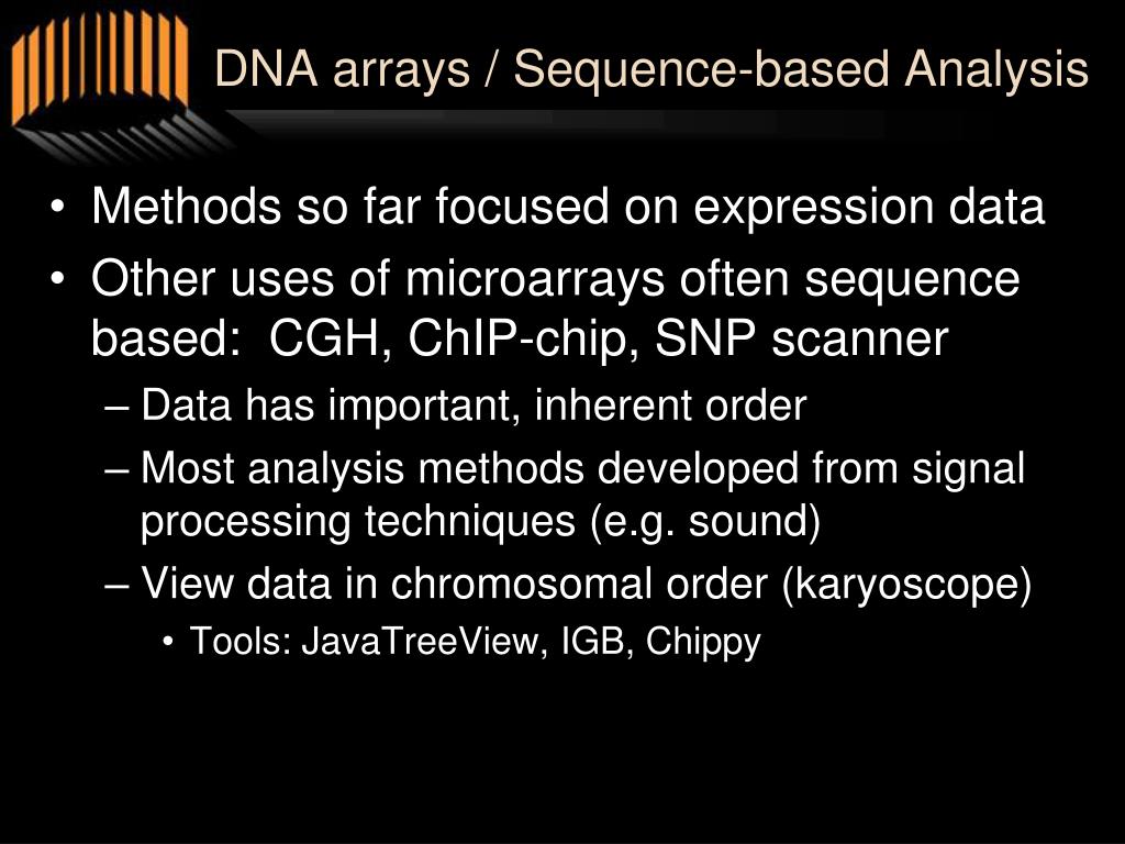 DNA arrays / Sequence-based Analysis • Methods so far focused on expression data • Other uses of microarrays often sequence based: CGH, ChIP-chip, SNP scanner • Data has important, inherent order • Most analysis methods developed from signal processing techniques (e.g. sound) • View data in chromosomal order (karyoscope) • Tools: JavaTreeView, IGB, Chippy