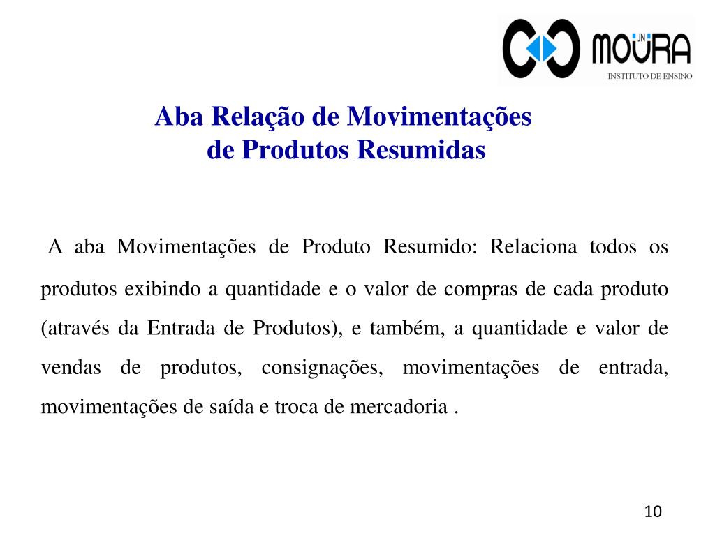 Aba Relação de Movimentações de Produtos Resumidas A aba Movimentações de Produto Resumido: Relaciona todos os produtos exibindo a quantidade e o valor de compras de cada produto (através da Entrada de Produtos), e também, a quantidade e valor de vendas de produtos, consignações, movimentações de entrada, movimentações de saída e troca de mercadoria .