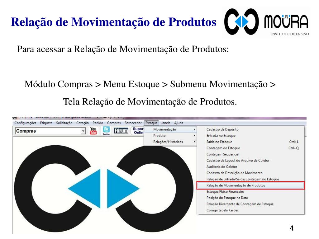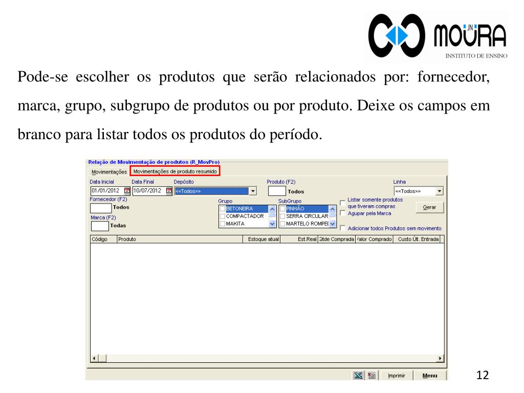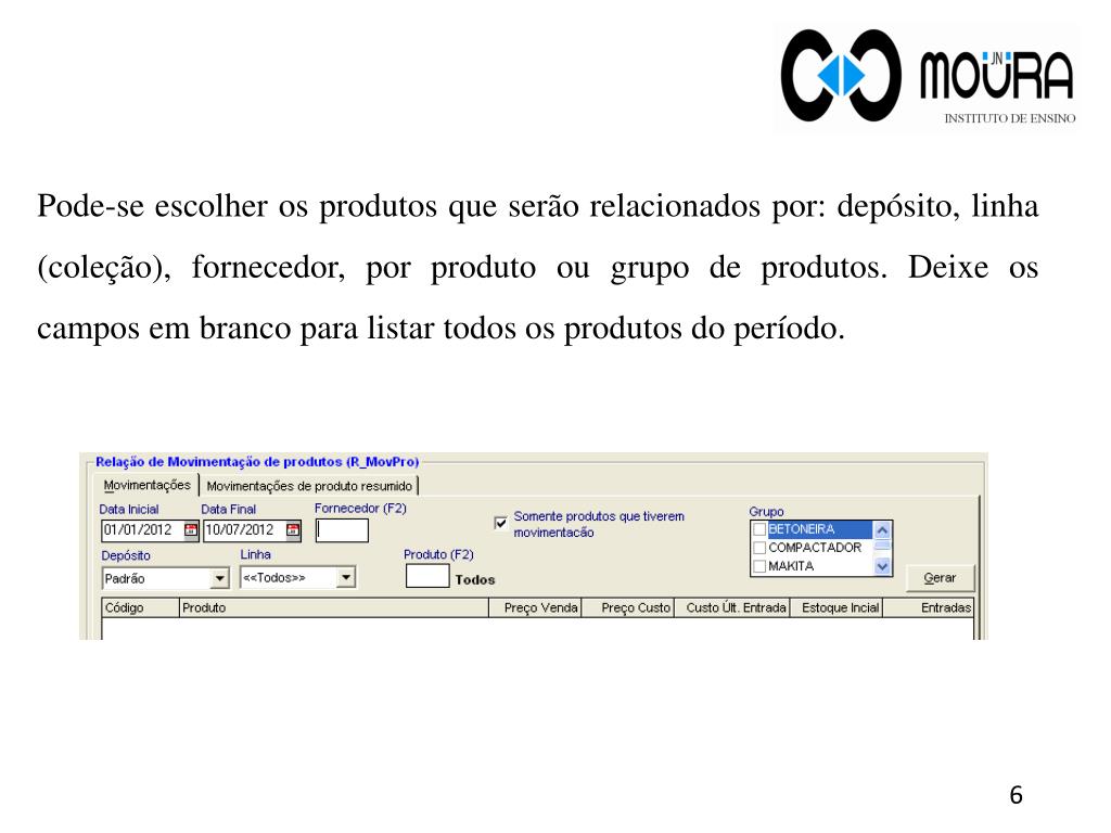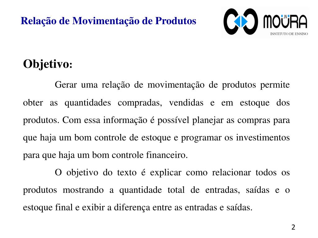 Relação de Movimentação de Produtos Objetivo: Gerar uma relação de movimentação de produtos permite obter as quantidades compradas, vendidas e em estoque dos produtos. Com essa informação é possível planejar as compras para que haja um bom controle de estoque e programar os investimentos para que haja um bom controle financeiro. O objetivo do texto é explicar como relacionar todos os produtos mostrando a quantidade total de entradas, saídas e o estoque final e exibir a diferença entre as entradas e saídas.