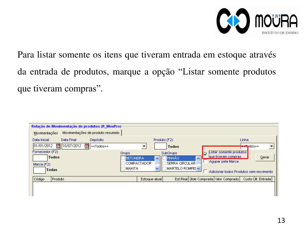 Para listar somente os itens que tiveram entrada em estoque através da entrada de produtos, marque a opção “Listar somente produtos que tiveram compras”.