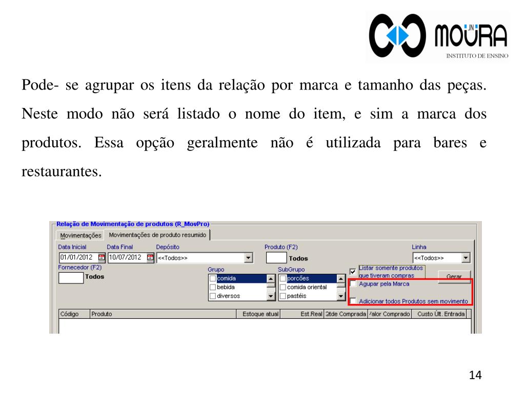 Pode- se agrupar os itens da relação por marca e tamanho das peças. Neste modo não será listado o nome do item, e sim a marca dos produtos. Essa opção geralmente não é utilizada para bares e restaurantes.