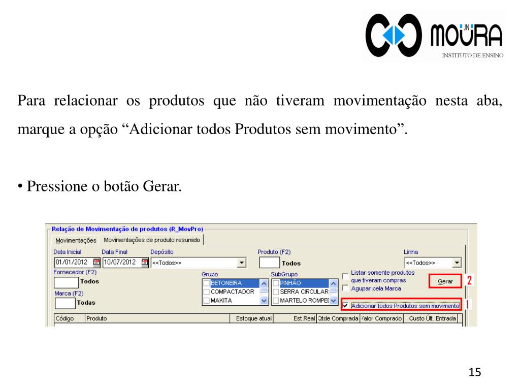 Para relacionar os produtos que não tiveram movimentação nesta aba, marque a opção “Adicionar todos Produtos sem movimento”. • Pressione o botão Gerar.