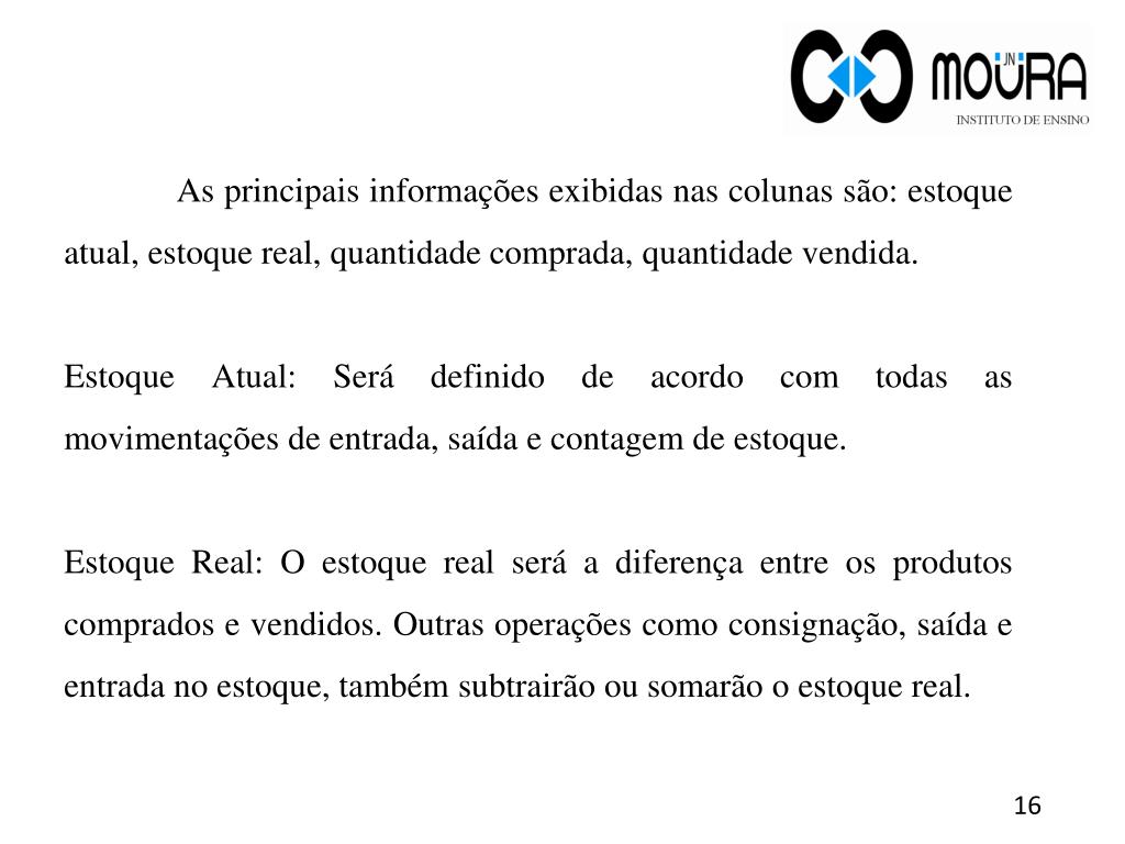 As principais informações exibidas nas colunas são: estoque atual, estoque real, quantidade comprada, quantidade vendida. Estoque Atual: Será definido de acordo com todas as movimentações de entrada, saída e contagem de estoque. Estoque Real: O estoque real será a diferença entre os produtos comprados e vendidos. Outras operações como consignação, saída e entrada no estoque, também subtrairão ou somarão o estoque real.