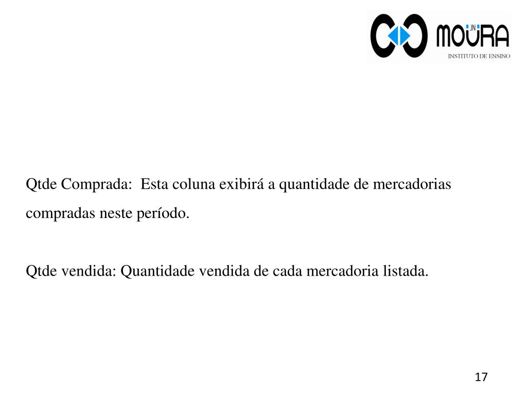 Qtde Comprada: Esta coluna exibirá a quantidade de mercadorias compradas neste período. Qtde vendida: Quantidade vendida de cada mercadoria listada.