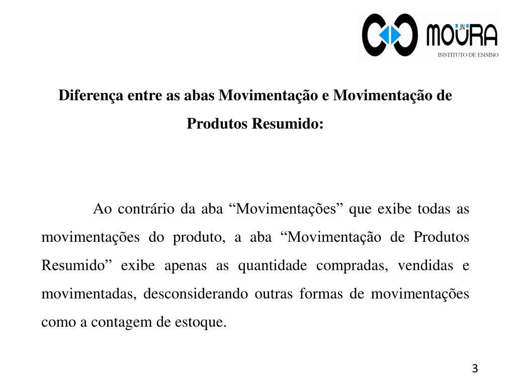 Diferença entre as abas Movimentação e Movimentação de Produtos Resumido: Ao contrário da aba “Movimentações” que exibe todas as movimentações do produto, a aba “Movimentação de Produtos Resumido” exibe apenas as quantidade compradas, vendidas e movimentadas, desconsiderando outras formas de movimentações como a contagem de estoque.