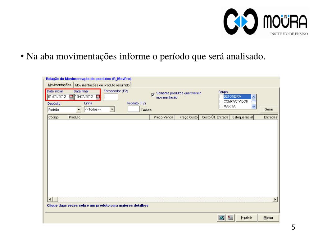 Na aba movimentações de produto resumido informe o período que será analisado.