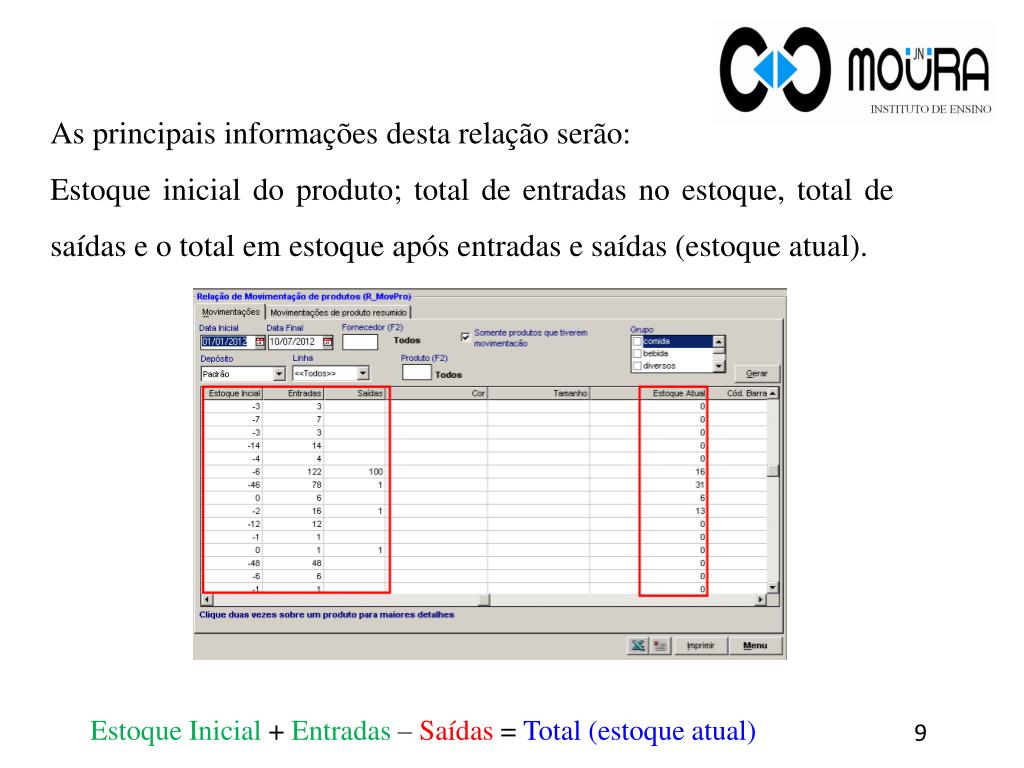 As principais informações desta relação serão: Estoque inicial do produto; total de entradas no estoque, total de saídas e o total em estoque após entradas e saídas (estoque atual). Estoque Inicial +Entradas– Saídas =Total (estoque atual)