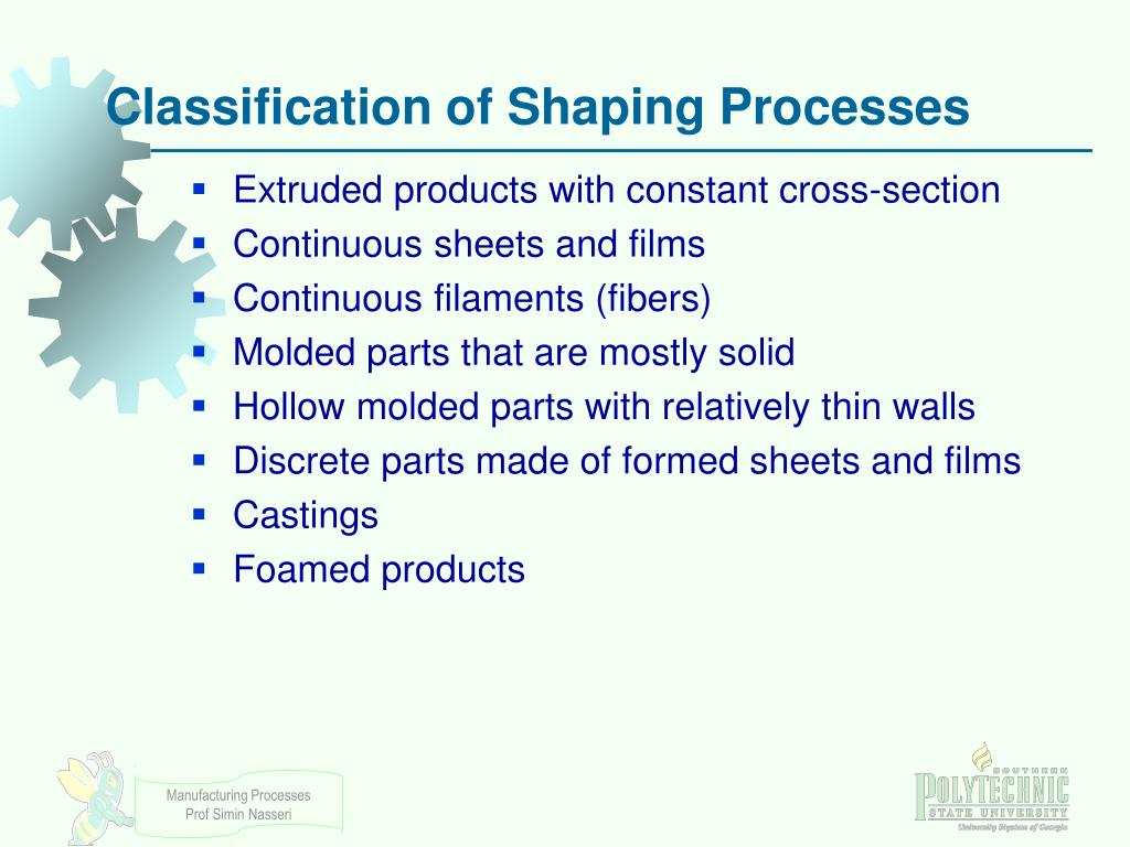 Classification of Shaping Processes • Extruded products with constant cross‑section • Continuous sheets and films • Continuous filaments (fibers) • Molded parts that are mostly solid • Hollow molded parts with relatively thin walls • Discrete parts made of formed sheets and films • Castings • Foamed products