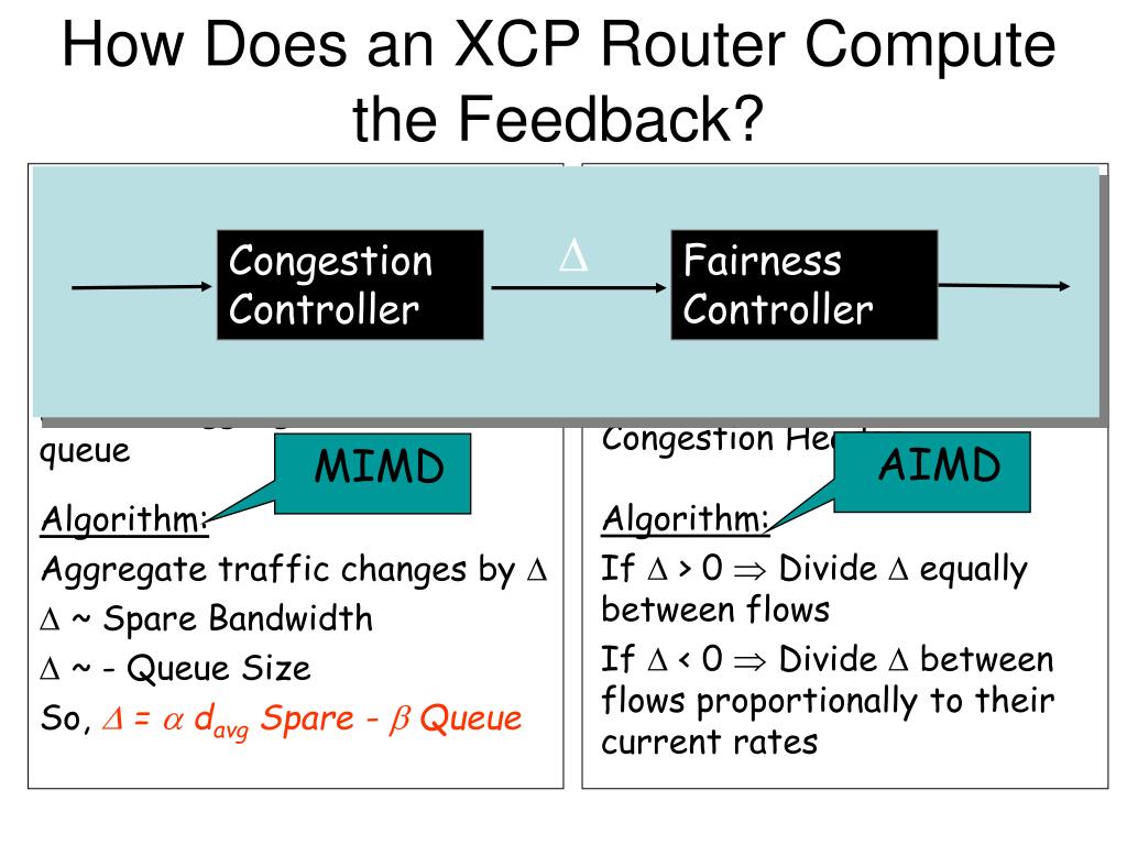 Round Trip Time Congestion Window Feedback = + 0.1 packet How does XCP Work? Feedback = - 0.3 packet