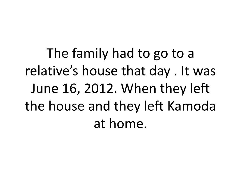 The family had to go to a relative’s house that day . It was June 16, 2012. When they left the house and they left Kamoda at home.