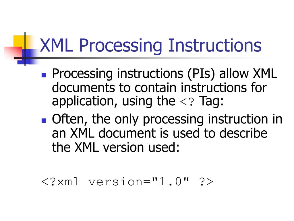 XML Processing Instructions • Processing instructions (PIs) allow XML documents to contain instructions for application, using the <? Tag: • Often, the only processing instruction in an XML document is used to describe the XML version used: <?xml version="1.0" ?>