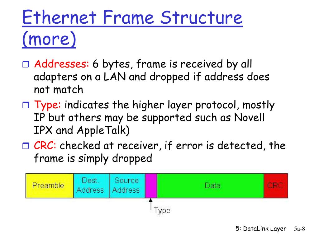 Ethernet Frame Structure (more) • Addresses: 6 bytes, frame is received by all adapters on a LAN and dropped if address does not match • Type: indicates the higher layer protocol, mostly IP but others may be supported such as Novell IPX and AppleTalk) • CRC: checked at receiver, if error is detected, the frame is simply dropped 5: DataLink Layer