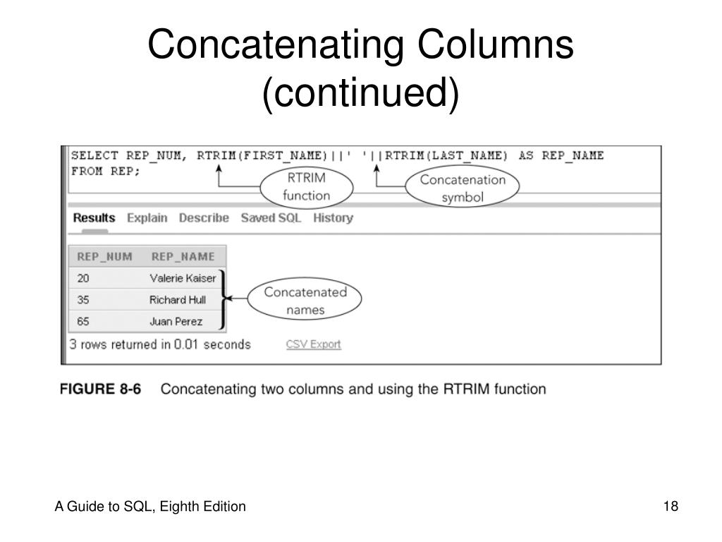 Concatenating Columns • Concatenate • Combine two or more columns into a single expression • Type two vertical lines (||) (Oracle) • & symbol (Access) • + symbol (SQL Server) • RTRIM function • Removes extra spaces to the right of a value A Guide to SQL, Eighth Edition
